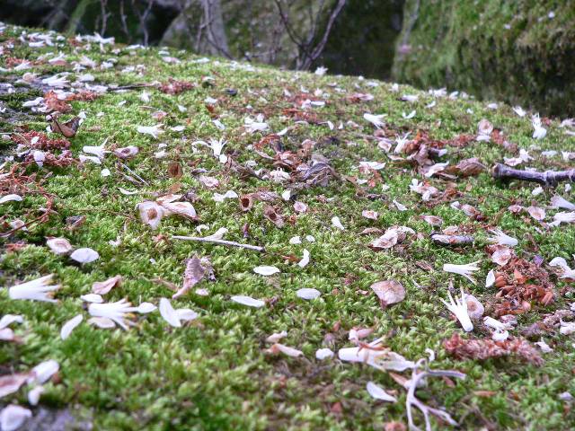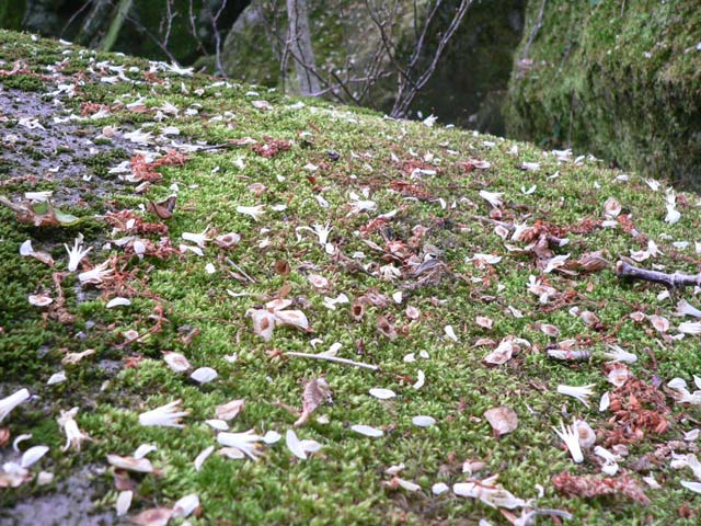 倒木のコケの上に花びらが落ちている