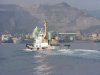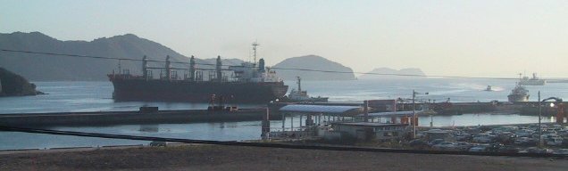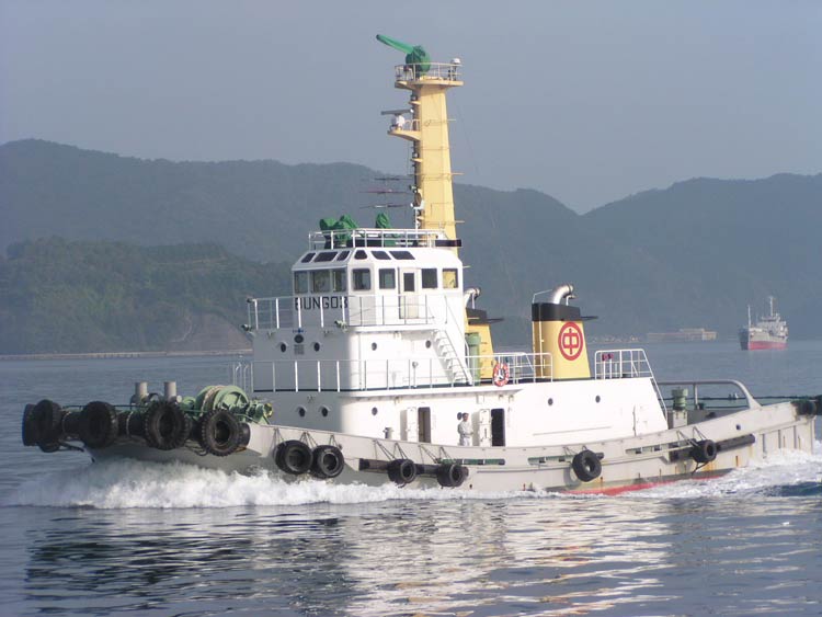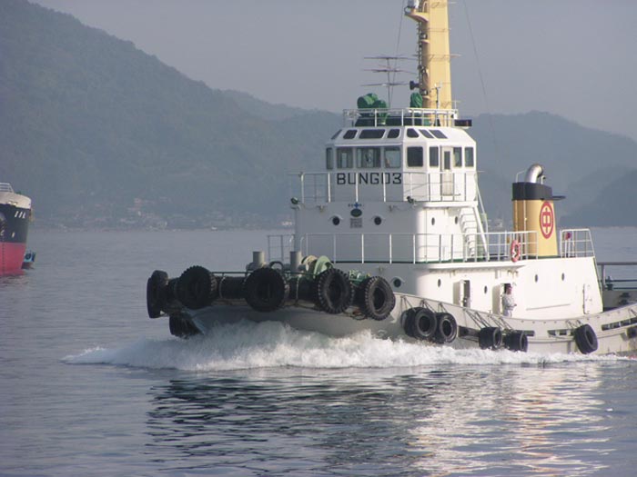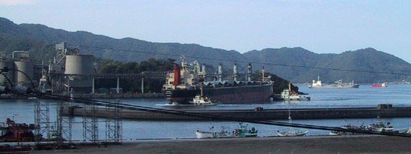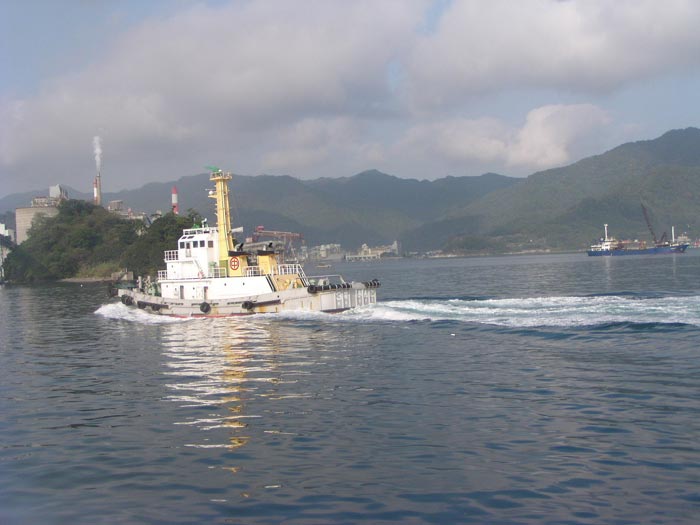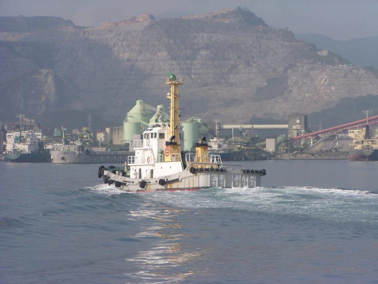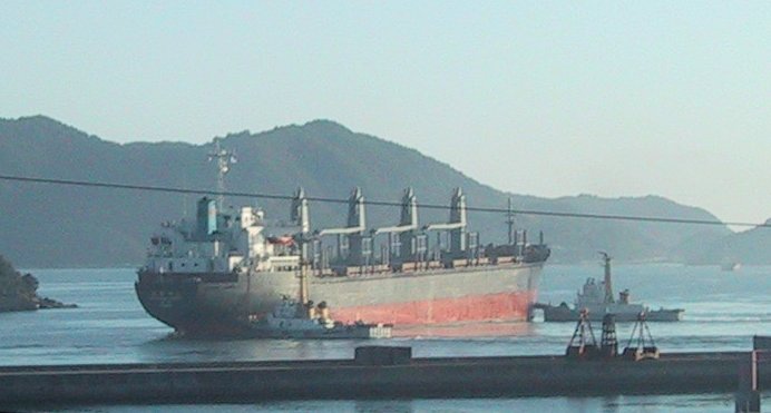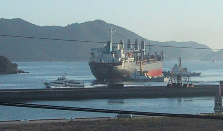 2001/9/23/07:00大きな貨物船が停泊してる?と思っていたらタグボート「ぶんご」に振り回されていました 中学校の運動会で日曜日というのに、これから荷役ですぐ出航かな? |
