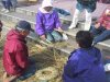 机を下に入れ、縄を押さえる人、紐を送る人、その紐を受けて回して返す人、紐をしばる人、藁を束ねてねじって押さえる人(私)