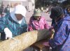 昼食の弁当と豚汁もらったけど手が震えて落としそう、中心よりすこし後方からしめ縄つくりに参加