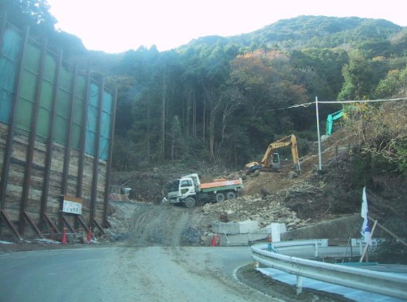 2001/10/27 鳩浦からの農道が抜けてきます 取付道路工事中 砂防ダムの所です |
