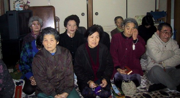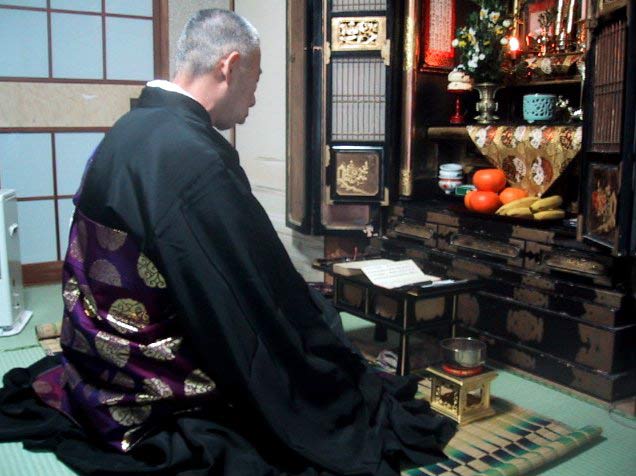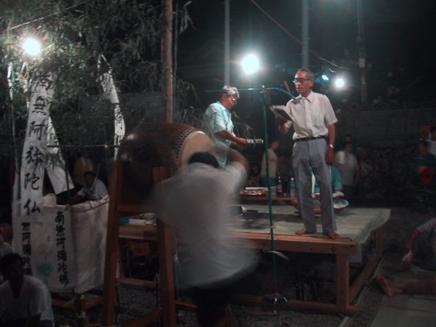 2001/1/20/10:30大寒雨/祖母50回忌/父25回忌の法事 雨のせいか参り手が少なかった。お下がりがあると、部落の皆さんがお参りしてくれて一緒にお経をあげ説教を聞きます。私は灯り(蝋燭)を替えて香(線香と香)を新たに焚きます。しびれた足を引きずるのがいやで、あぐらをかいています。お寺は鳩浦の立法寺です |