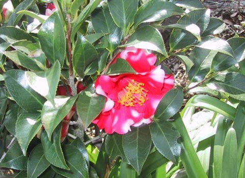 2001/3/2 清見の収穫 庭のサザンカをストロボ焚いて撮影 福岡で買ってきた花らしい |