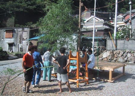 8/15/5:30 寝過ごしたので展望台に上る 雲からでた陽は強すぎた 消防団の盆踊り準備を手伝う ポンプと井戸 |